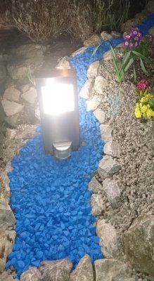 aus azurblauem Zierkies neben dem Lavendelfeld. :-)