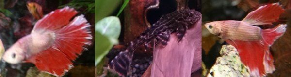 einen Kampffisch (betta splendens), 7 Schleier-Kardinalfische sowie 2 Ottos und 2 Schnecken.
